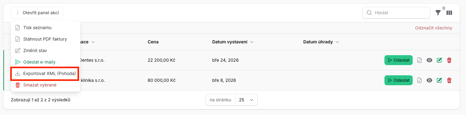 3. Nad tabulkou klikněte na tlačítko Otevřít panel akcí a zvolte možnost Exportovat XML (Pohoda).