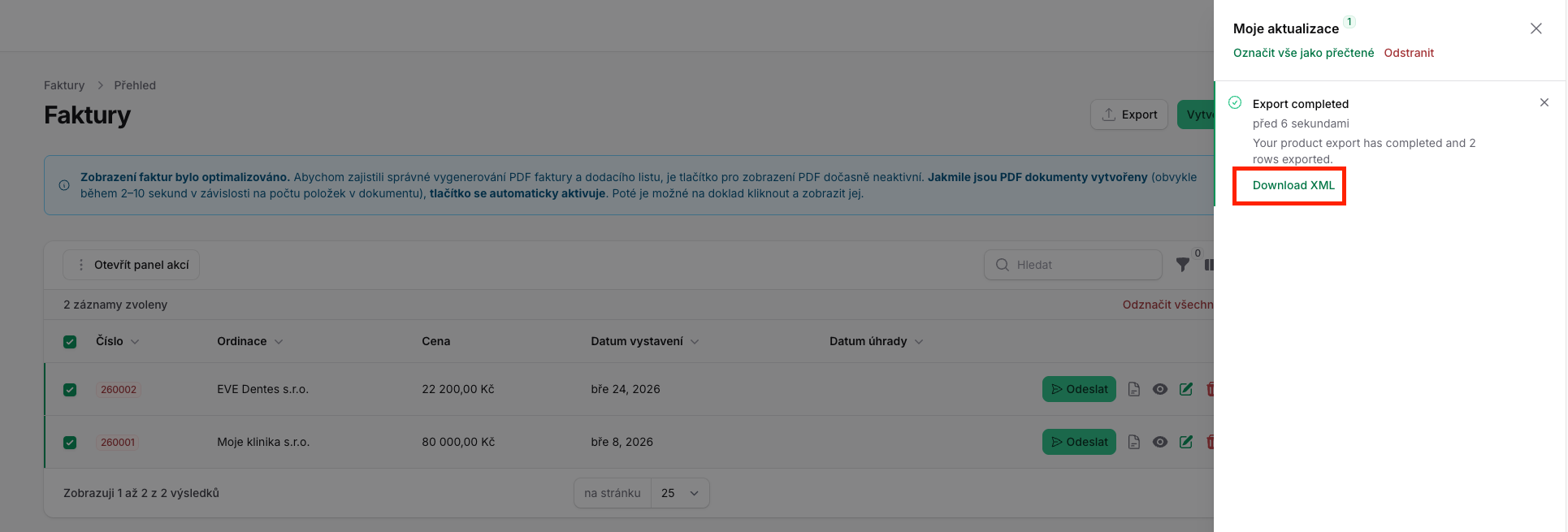 V notifikačním zvonku v horní liště se zobrazí upozornění. Otevřete jej a u informace o exportu klikněte na tlačítko Download XML pro stažení souboru, který následně nahrajete do Pohody: