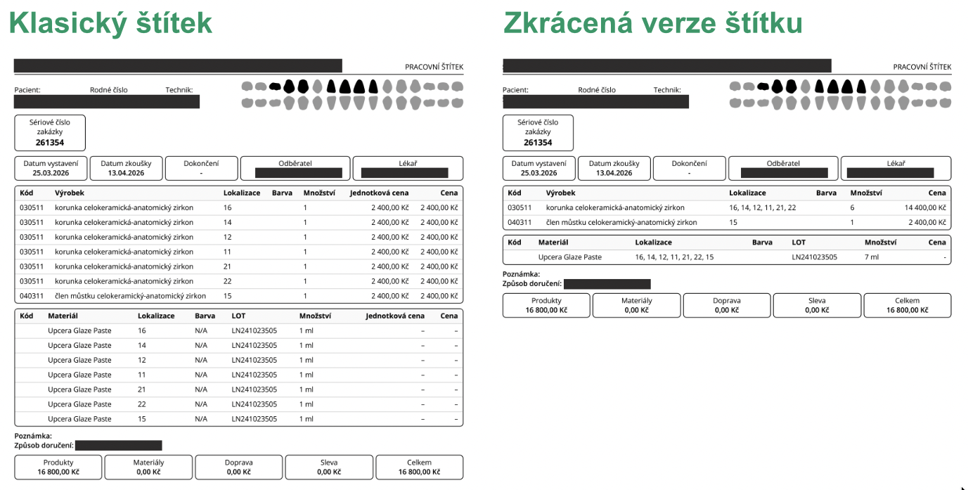 U zakázky je nově možné vytisknout zkrácenou verzi štítku, ve které jsou výrobky a materiály seskupeny vždy do jednoho řádku a nejsou rozepsány po řádcích podle konkrétních indikací. Původní plnohodnotný štítek zůstává v aplikaci zachován. Laboratoře si tak mohou vybrat, zda budou tisknout plnou, nebo zkrácenou verzi štítku podle svých potřeb.