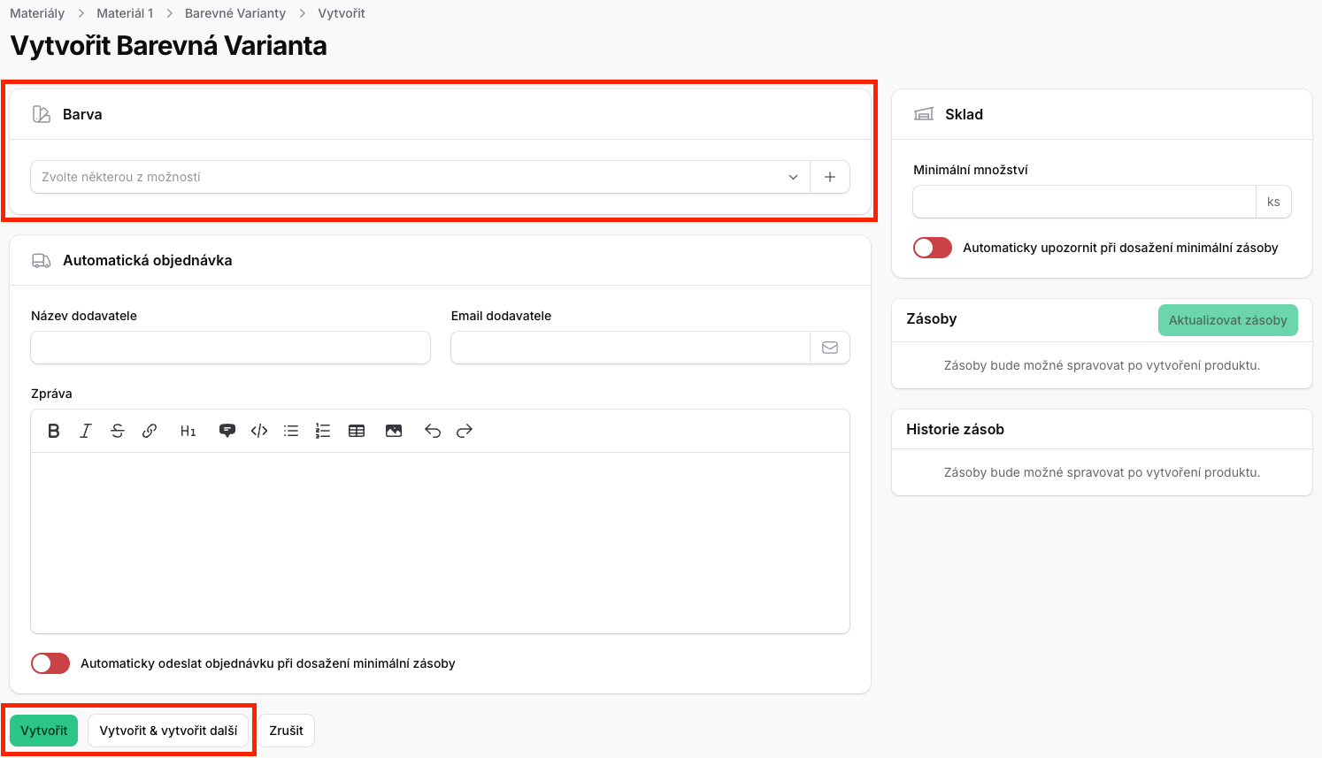 TIP: Pokud u vytvořené barevné varianty chcete hned přidat šarži, postupujte podle návodu pro přidání šarží.
