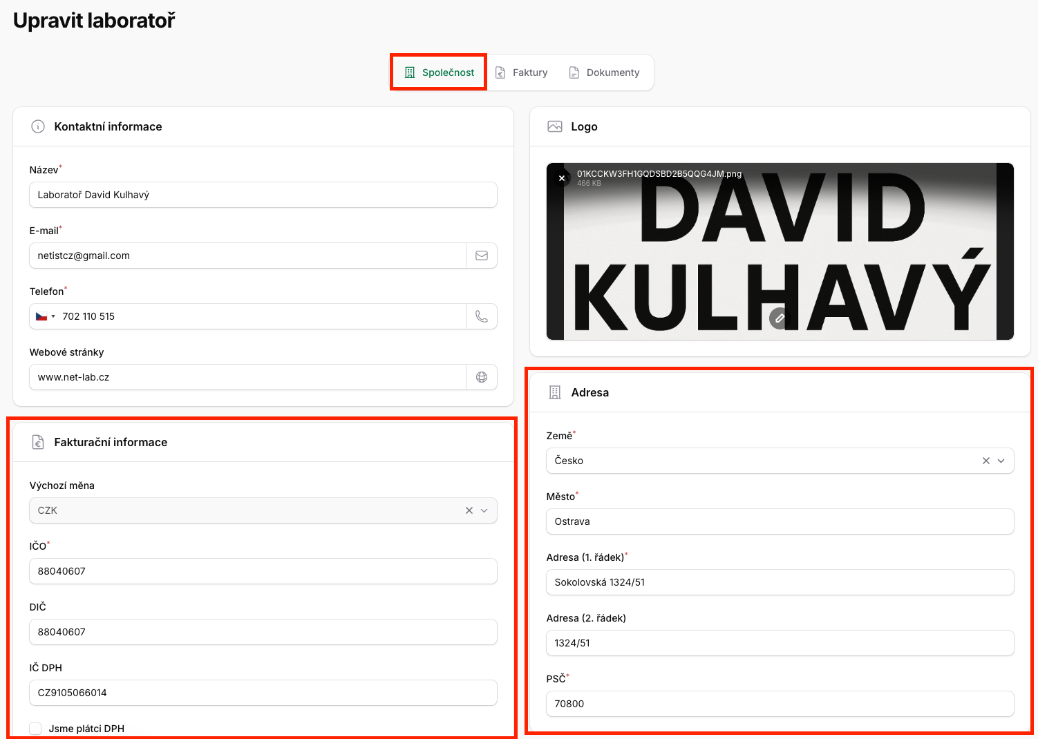 Fakturační údaje jsou automaticky předvyplněny při registraci laboratoře. Pokud je potřebujete upravit, klikněte v levém horním rohu na název laboratoře a z nabídky vyberte možnost Upravit laboratoř.