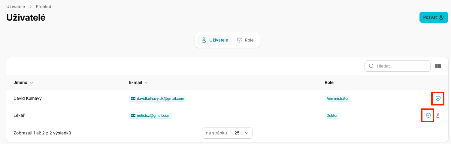 Každému uživateli/lékaři můžete přiřazovat role podle toho, do jakých částí aplikace má mít přístup. Na stránce Uživatelé v řádku s konkrétním uživatelem klikněte na ikonu zeleného štítu.