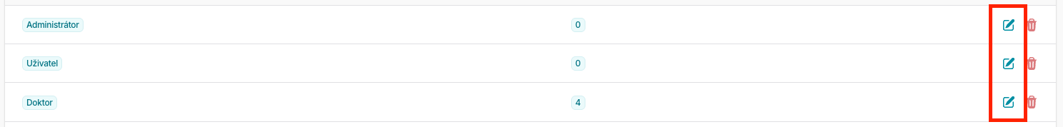 Na stránce Uživatelé se přepněte do sekce Role. Následně u role, kterou chcete upravit klikněte na ikonu tužky.