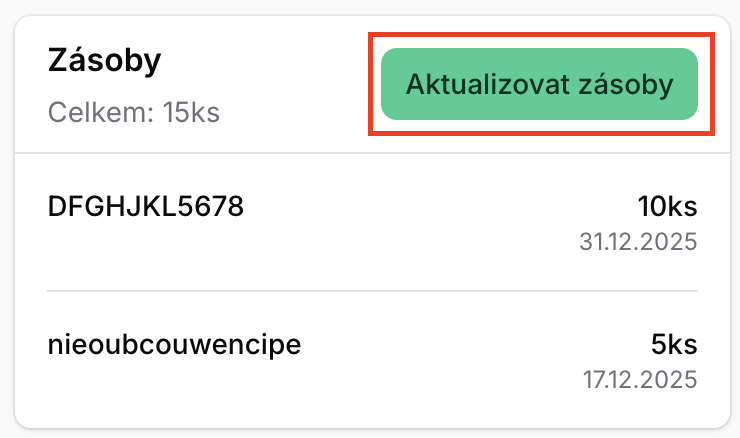 Pro zápis šarží budete pracovat pouze s boxem Zásoby na pravé části stránky, kde se nachází také tlačítko pro naskladnění.