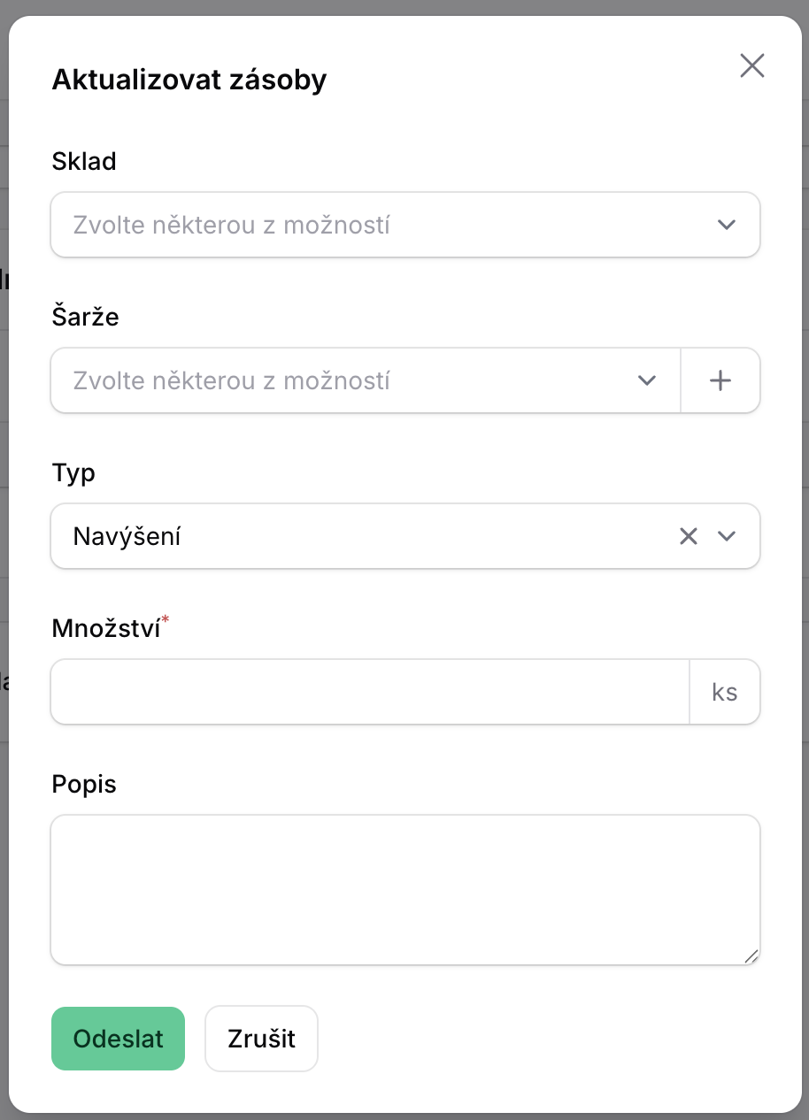 V poli Typ ponechte možnost Navýšení (tato volba se používá také při vyskladnění, pokud již byla část šarže spotřebována).