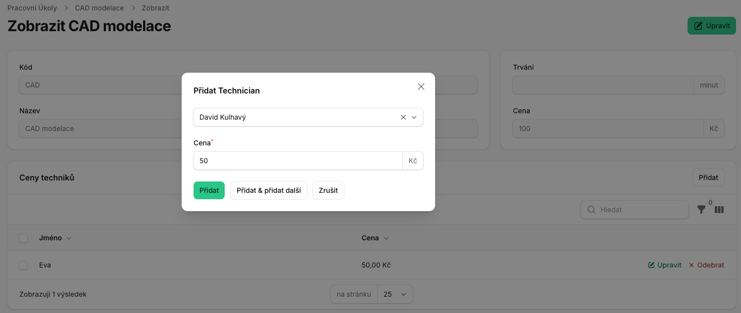 Pro nastavení otevřete kartu již vytvořeného úkolu. Pod základními informacemi se zobrazí tabulka, kde pomocí tlačítka „Přidat“ nastavíte individuální odměny pro jednotlivé techniky. Vyberte technika, nastavte požadovanou výši odměny a potvrďte tlačítkem Přidat.