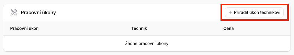 V kartě zakázky najděte sekci pro zadávání pracovních úkolů a klikněte na tlačítko Přidat úkon technikovi.
