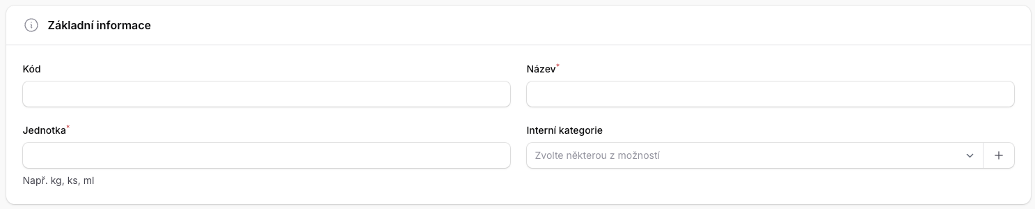 Jednotka – povinná položka, ve které určíte jednotku materiálu. Využívá se především u zboží s automatickým odečítáním ze skladu. Jde pouze o označení jednotky – její název nemá přímý vliv na funkčnost, ale pouze na způsob zobrazení v aplikaci.