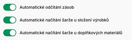 Automatické načítání šarže u složení výrobků – pokud je funkce zapnutá, u materiálů, které se do zakázky načítají automaticky podle zvolených výrobků, se automaticky doplní správná šarže uložená u materiálu. Pokud funkci vypnete, šarže se nenačte automaticky a můžete ji v zakázce vybrat nebo zadat ručně, případně načíst čtečkou přímo z obalu.