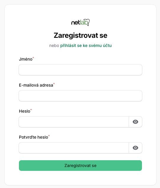 Registrační formulář, ve kterém vyplníte své jméno, e-mail a nastavíte heslo pro přihlášení do aplikace najdete na adrese https://lab.net-lab.eu/register: